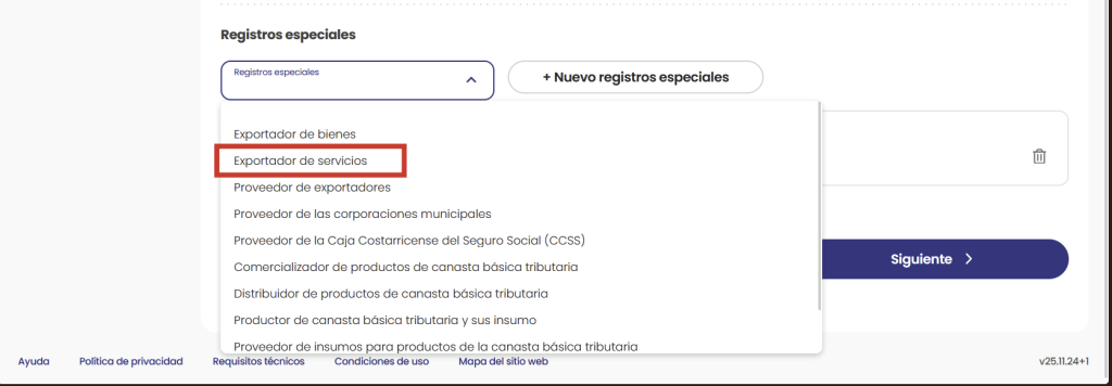 En la modificación al RUT deberás llegar al paso 3 en el que podrás modificar tus actividades económicas. Ahí, al final de la pantalla encontrarás la opción de Registros Especiales donde podrás añadir un nuevo registro especial a tu RUT. Deberás seleccionar el de Exportador de Servicios.